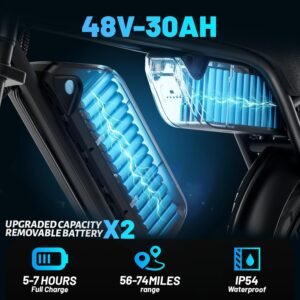 🔋🔋Dual 48V15Ah Removable Battery: electric bike for adults are equipped with dual 48V 15Ah batteries (total of 30Ah), large capacity and dual battery features for longer bike range, which are UL certified and have a BMS system, making our battery safer and more cycle life. Removable battery makes it easy to charge, 7-8 hours fully charged