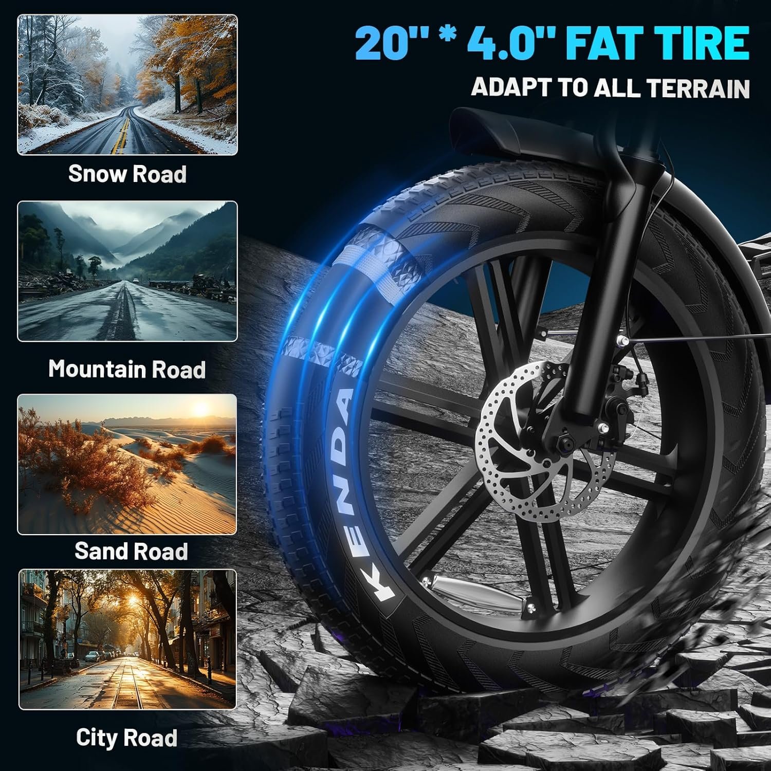 - 🚴‍♀20”x4.0 Fat Tire Electric Bike: 20”*4.0 fat tire increase the contact area with the ground to make smooth and stable riding and provide you a better travel experience. At the same time, electric mountain bike come with a Shi-mano 7-speed system, offering more accurate and smooth gear changes. Even when facing different terrains, the ebike is able to shift gears quickly according to riding modes